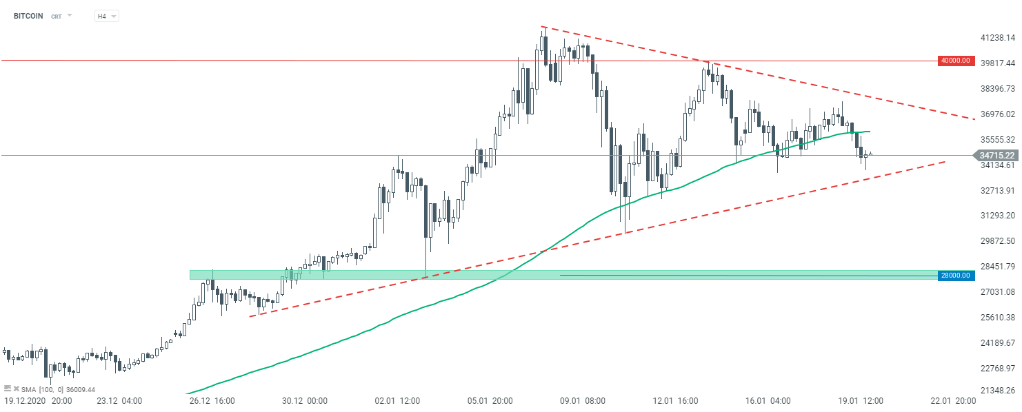 Desde el punto de vista técnico, en el gráfico de Bitcoin se observa una ralentización del momentum alcista en últimas sesiones. De hecho, se puede apreciar un movimiento bajista tras la primera ruptura por encima de los 40.000 USD. Tras un siguiente intento de atravesar al alza en este canal (infructuoso), se espera actualmente una caída mayor. El soporte más cercano se halla cerca de la lína de tendencia alcista señalada en el gráfico. De conseguir los bajistas romper a la baja esta frontera, el movimiento en esta dirección podría alcanzar los 28.000 USD; en caso contrario, de atravesarse la línea de tendencia bajista, podría buscarse de nuevo la barrera de los 40.000 USD.