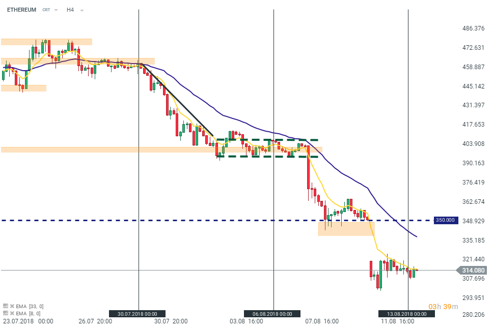 Ethereum experimentó una pérdida significativa durante el fin de semana. Incluso rompió el soporte de los 300$ por un tiempo. Sin embargo, la criptomoneda logró recuperar ese nivel y actualmente se mueve por ligeramente por debajo de su media móvil de 8 periodos en velas de H4 (línea amarilla en el gráfico). Se observa cómo la media móvil comentada se encuentra justo por encima de los precios de cierre de las velas anteriores. Fuente: xStation5