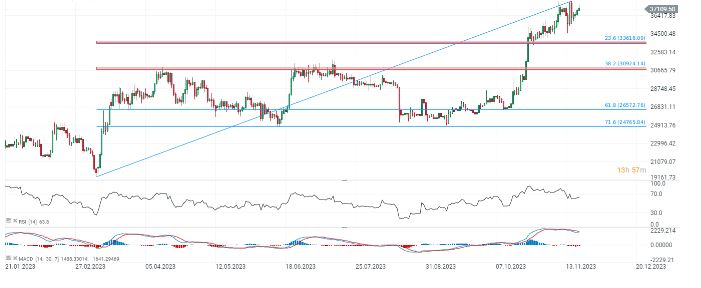 Según los analistas de Bloomberg, existe un 90% de posibilidades de que las solicitudes de ETF se aprueben antes del 10 de enero de 2024. Dado que la concentración de volumen entre 33.000 y 35.000 dólares es baja, un nivel de 33.000 dólares puede ser un posible "fondo" para una corrección a corto plazo.