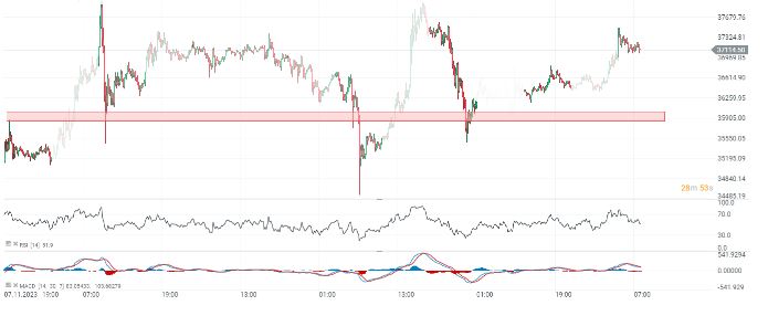 BITCOIN ha retrocedido dos veces desde el nivel de $37,800, y el repunte ahora se ha detenido cerca de $37,500, lo que indica que la oferta, que no logró beneficios durante los dos repuntes anteriores, ha decidido aprovechar el rebote y entregar BTC a nuevos compradores. El rango de precios clave a tener en cuenta en el corto plazo sigue siendo de 36.000 dólares. Un retroceso por debajo de este nivel podría sugerir una corrección a $33 000, ya que el nivel entre $35 000 y $33 000 es muy ligero en términos de número de operaciones y concentración de volumen. Por otro lado, un repunte hasta los 38.000 dólares podría presagiar una prueba de los 40.000 dólares. Fuente: xStation5