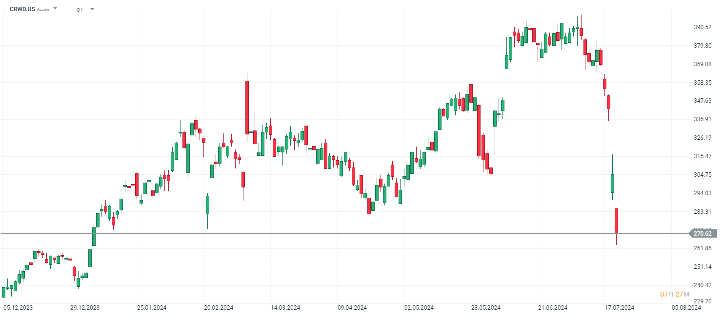 Las acciones de CrowdStrike subían más de un 50% en este 2024 antes del incidente, tras el que ahora tan solo acumulan una subida del 8% en este 2024.