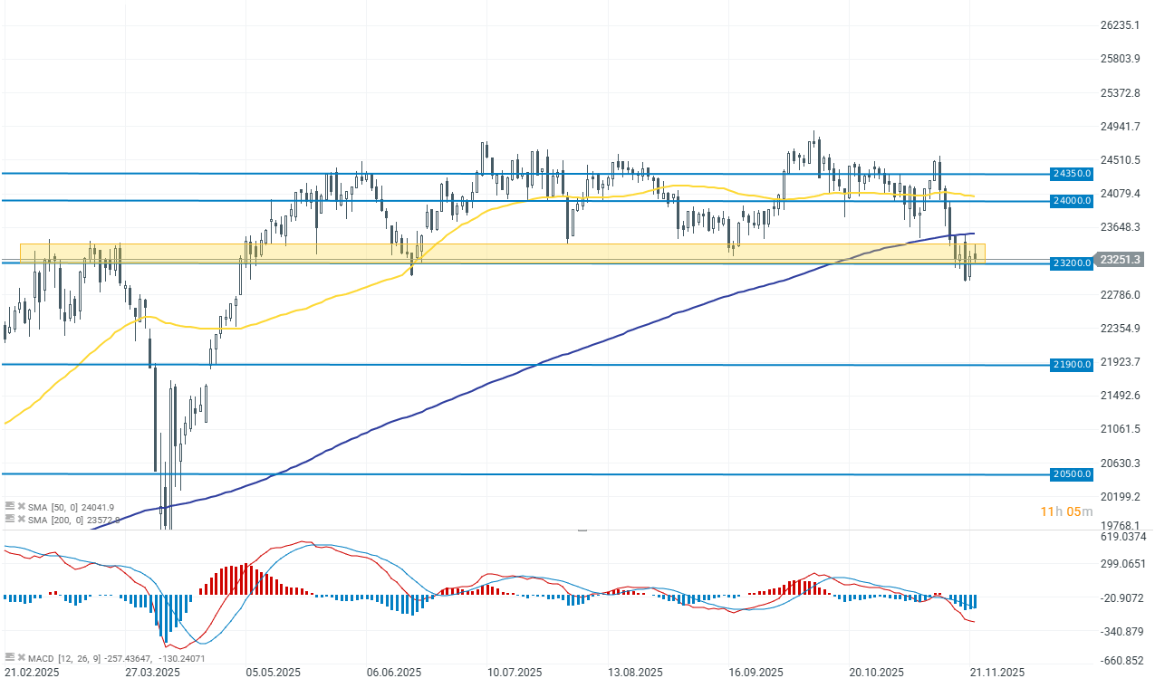 El índice alemán está probando actualmente el límite inferior del canal de consolidación establecido desde finales de abril de este año. Este es el período más largo hasta la fecha en torno a la zona de los 23.200 puntos. Si los alcistas no logran mantener este soporte, la ola de ventas podría profundizarse rápidamente desde una perspectiva técnica.