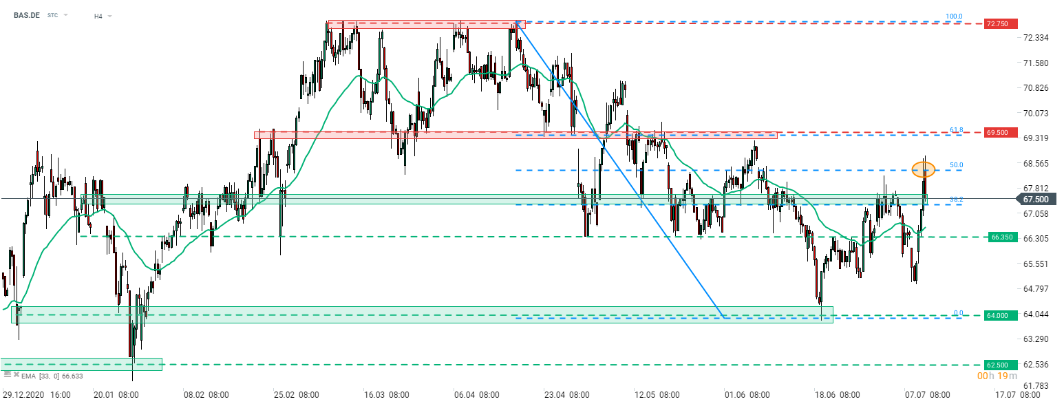 BASF (BAS.DE) extendió el movimiento ascendente al comienzo de la negociación de hoy. Sin embargo, los alcistas no pudieron mantener estas ganancias durante mucho tiempo y la acción retrocedió luego de un intento fallido de superar el 50% de retroceso de una corrección reciente (círculo naranja, área de 68,35 €). La zona que se sitúa por encima del retroceso del 38,2% (67,35 €) es un soporte a tener en cuenta a corto plazo. Fuente: xStation5