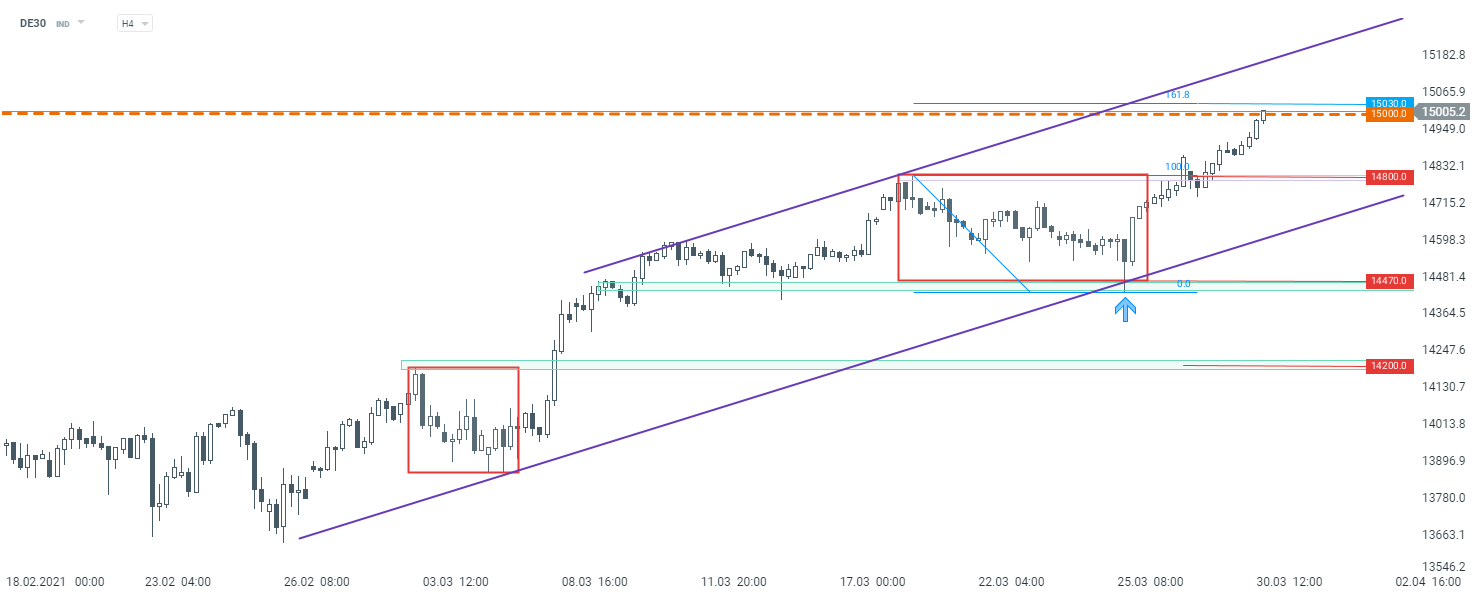 El DAX alemán continúa con el movimiento alcista durante la sesión de hoy. El índice ha roto el nivel psicológico de los 15.000 pts manteniéndose estable en un nuevo máximo histórico.Podemos ver que los inversores europeos han ignorado el riesgo del aumento de los rendimientos de los bonos americanos y esperan que se contenga el colapso de Archegos Capital. Mirando el gráfico de H4 desde un punto de vista técnico, el objetivo más cercano para los compradores se encuentra en los 15030 pts que está marcado con el retroceso del 161.8% de la reciente corrección a la baja local. Sin embargo, si los compradores logran mantener el impulso, no se puede excluir la prueba del límite superior del canal ascendente. El soporte más cercano se ubica alrededor de los 14,800 pts.