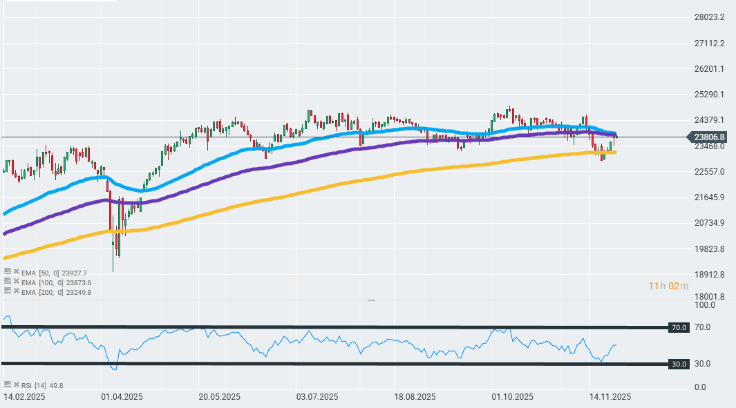 Durante la sesión del jueves, el DAX está probando la zona de control cerca de la media móvil exponencial de 50 días (curva azul en el gráfico) y la media móvil exponencial de 100 días (curva morada), que siguen actuando como una barrera que indica una tendencia bajista a corto plazo para el instrumento. Hasta que el DAX supere esta zona, es probable que la tendencia actual se mantenga.