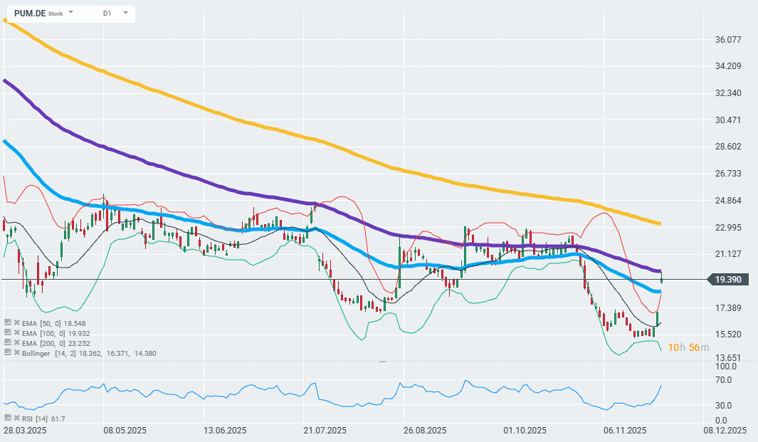 Las acciones de Puma están probando hoy la media móvil exponencial (EMA) de 100 días.