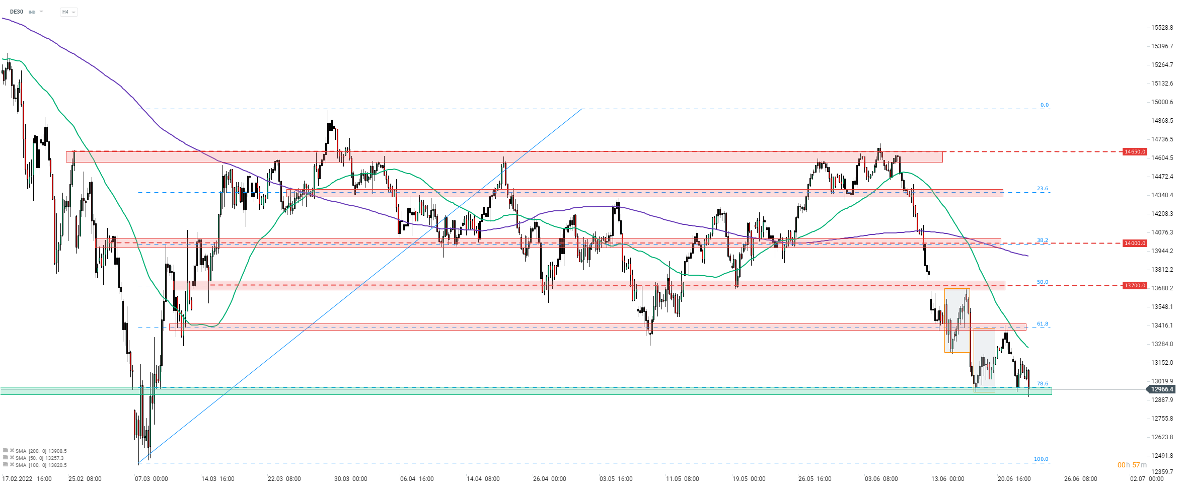 DE30 logró defender la zona de soporte de 13,000 pts marcada con un retroceso del 78.6% del movimiento alcista iniciado ayer a principios de marzo. Sin embargo, el alivio duró poco ya que el índice reanudó la caída esta mañana tras la publicación de los decepcionantes PMI de junio. Como resultado, la zona de soporte antes mencionada se está probando una vez más hoy. Si bien el índice alcanzó un nuevo mínimo de 3 meses esta mañana cerca de la marca de los 12,900 pts, los alcistas lograron recuperar algo de terreno y no se justifica una ruptura definitiva por debajo del retroceso del 78,6%. No obstante, las perspectivas para la renta variable alemana son bastante bajistas, especialmente porque el país ve que la situación del suministro de gas se deteriora aún más. En caso de ruptura por debajo, los mínimos de marzo en la zona de los 12,500 pts pueden estar en peligro.