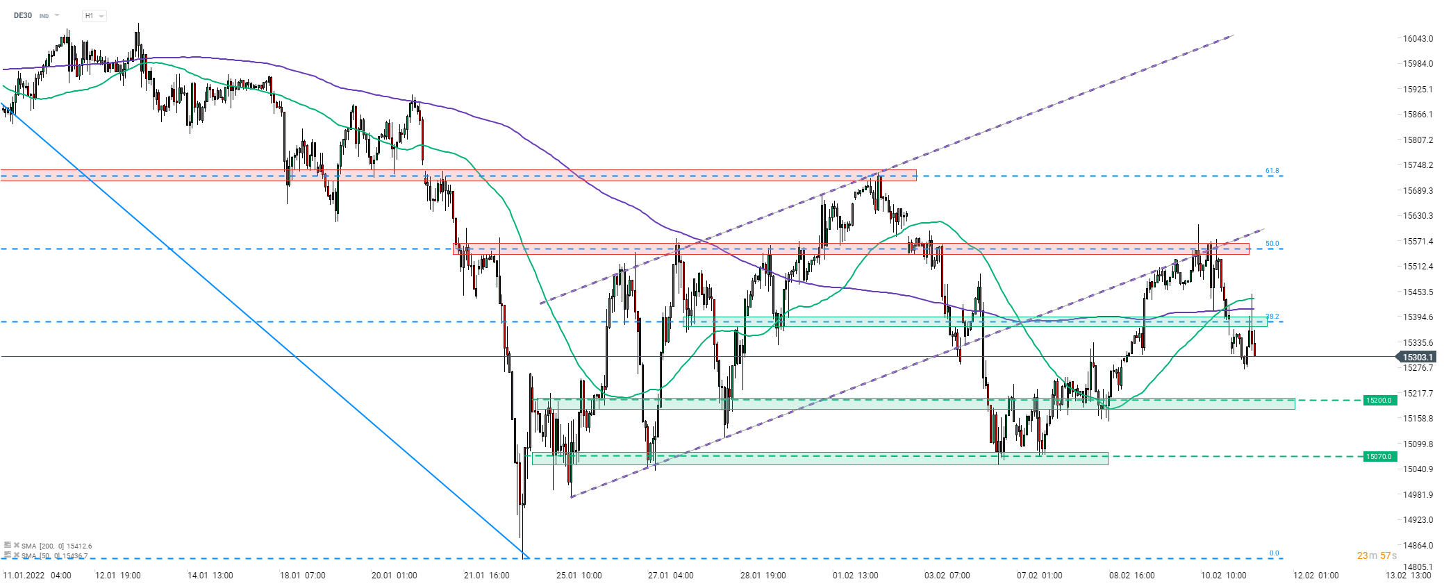 DE30 inició un fuerte movimiento a la baja tras la publicación de inflación de EE. UU. de ayer. El índice alemán retrocedió desde el área de resistencia marcada con el límite inferior del canal ascendente previamente roto y un retroceso del 50% del movimiento descendente iniciado a principios de 2022. El índice rompió por debajo de la zona de soporte con un retroceso del 38,2% hoy. Los alcistas intentaron hacer retroceder el precio por encima de esta zona al comienzo de la sesión de efectivo europea de hoy, pero han fallado. Dada una nueva prueba exitosa del área de soporte marcada con un retroceso del 38,2%, los comerciantes deben tener cuidado con otro posible tramo bajo. En tal escenario, el soporte más cercano a observar se puede encontrar en el área de 15,200 pts.