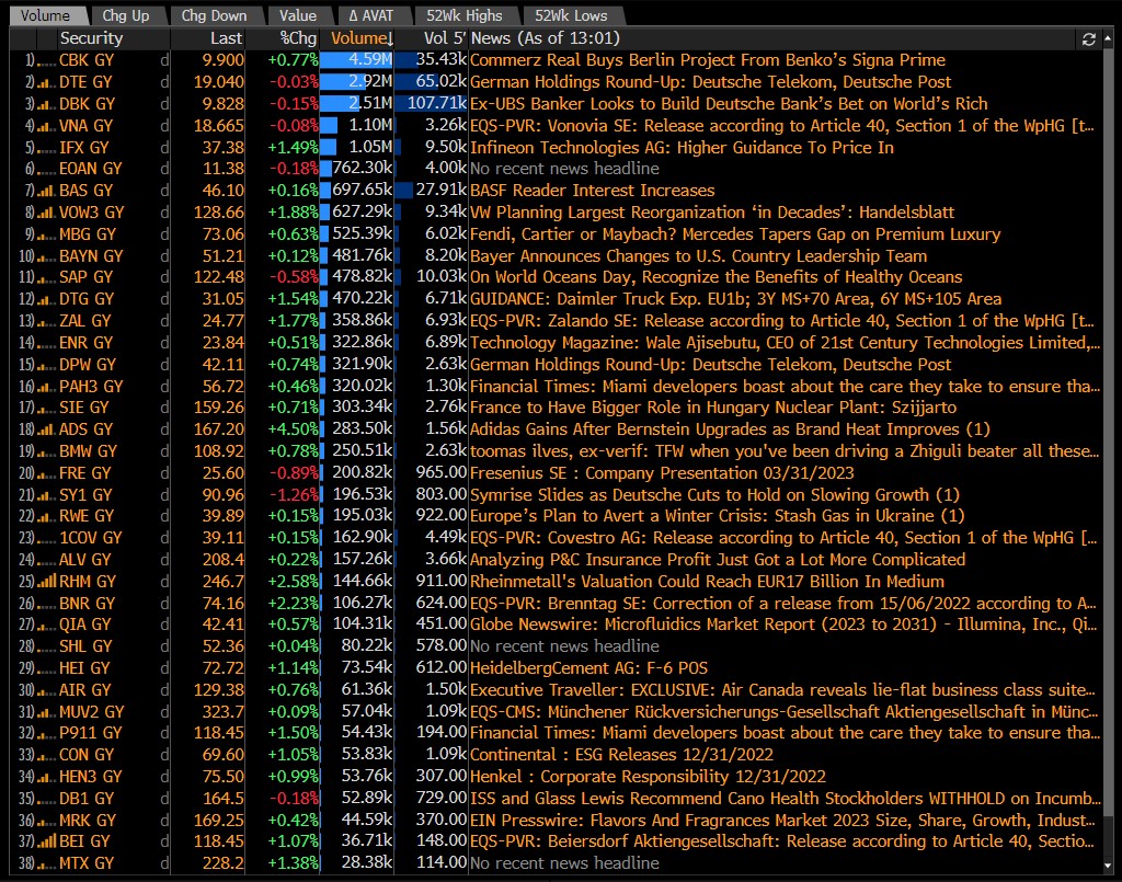 Los mayores cambios porcentuales e información de empresas individuales en el índice DAX. Fuente: Bloomberg