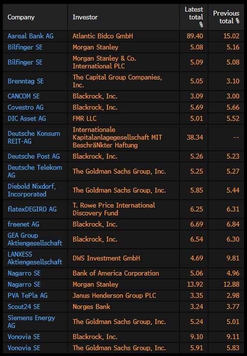 Cambios en las participaciones de la institución en empresas individuales del índice DAX (datos de la última sesión). Fuente: Bloomberg
