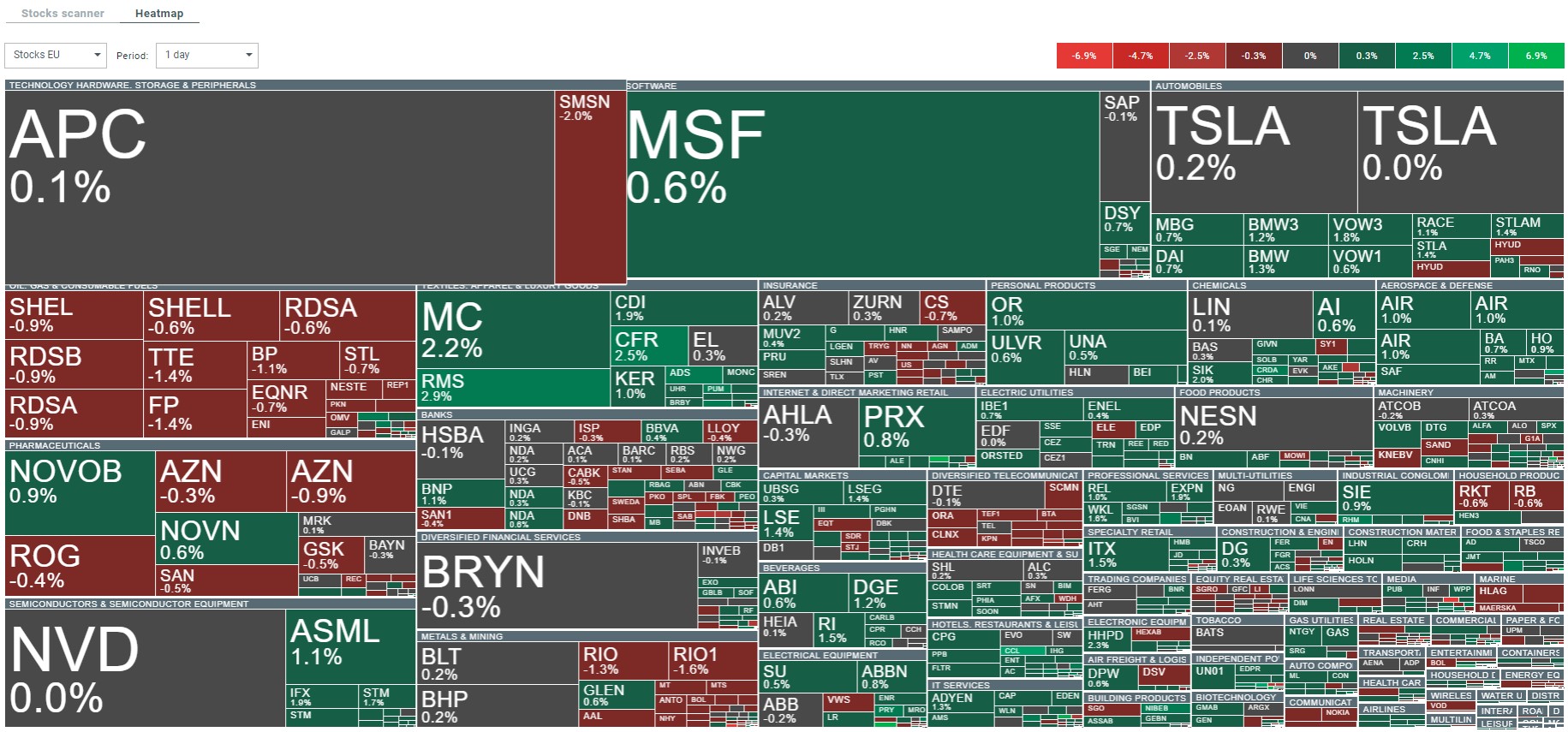 El estado de ánimo en Europa durante la sesión de negociación del lunes fue mayormente positivo. Los sectores de bienes de lujo, semiconductores, aviación y hotelería dominaron un sentimiento muy positivo. Fuente: xStation 5