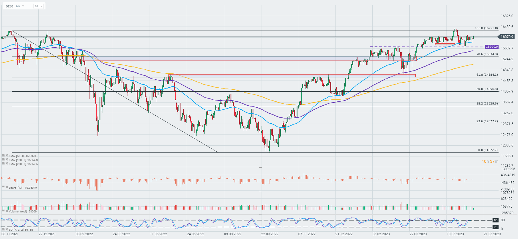 Los futuros alemanes DE30 están tratando de superar la estructura de consolidación establecida la semana pasada. En este punto, sin embargo, parte del impulso alcista de hoy ha sido anulado. Los contratos aún se mantienen por encima de la barrera psicológica de los 16.000 puntos. Fuente: xStation 5