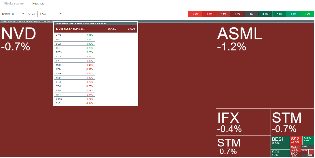 La debilidad en el mercado europeo de semiconductores hoy en día se desencadena principalmente por el anuncio del gigante mundial en lo que respecta a este sector, Taiwan Semiconductor Manufacturing Company (TSM.US), que notificó que el presupuesto de gastos de capital (capex) de este año estará cerca de el extremo inferior del pronóstico establecido anteriormente. Esto ha desalentado las esperanzas de que el reciente auge de la demanda de chips informáticos de inteligencia artificial anime a los fabricantes de chips a aumentar la capacidad de producción a corto plazo, lo que provocará una venta masiva de empresas europeas del sector.