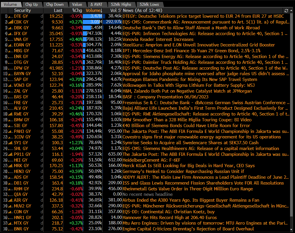 Mayores cambios porcentuales e información de empresas individuales en el índice DAX. Fuente: Bloomberg