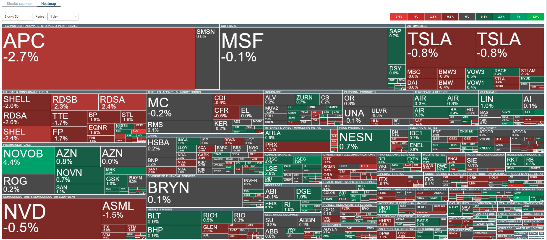 El estado de ánimo en Europa durante la sesión de negociación del martes es relativamente negativo. La debilidad la muestran principalmente las empresas de los sectores de tecnología, petróleo y semiconductores. Fuente: xStation 5