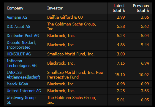Cambios en las participaciones institucionales en empresas individuales del índice DAX (datos de la última sesión). Fuente: Bloomberg