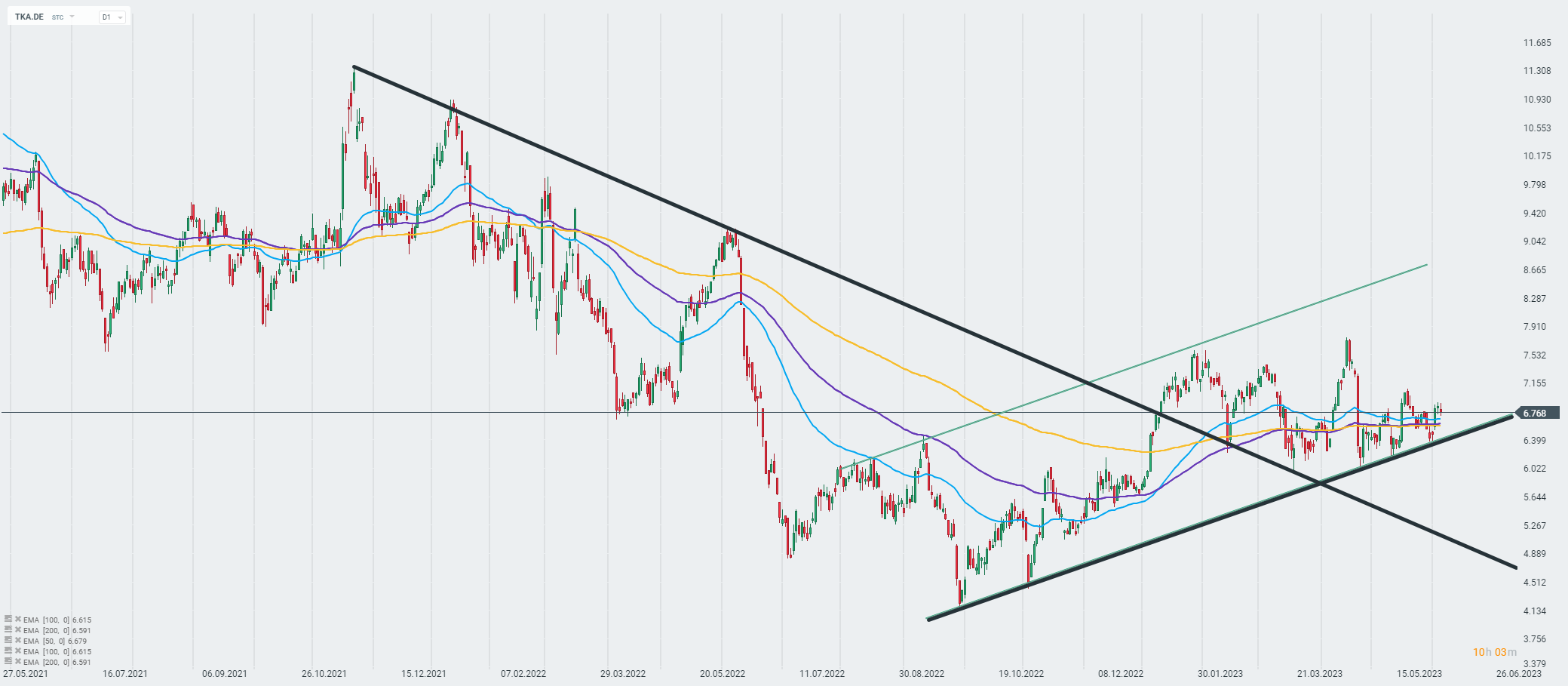 Gráfico del precio de las acciones de Thyssenkrupp AG (TKA.DE), intervalo D1. En este momento, las acciones de la compañía están probando el área de soporte definida por la formación del límite inferior de la tendencia alcista y cotizan por encima de la confluencia de las EMA de 50, 100 y 200 (curvas de colores; azul, violeta y oro respectivamente). Fuente: xStation 5