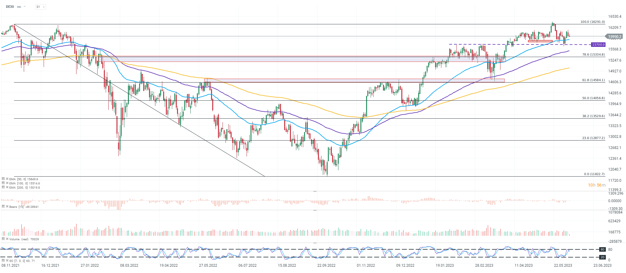 Los futuros basados en el índice alemán DAX (DE30) cotizan ligeramente a la baja hoy e intentan romper permanentemente por debajo de la zona mínima de la última sesión. Fuente: xStation 5