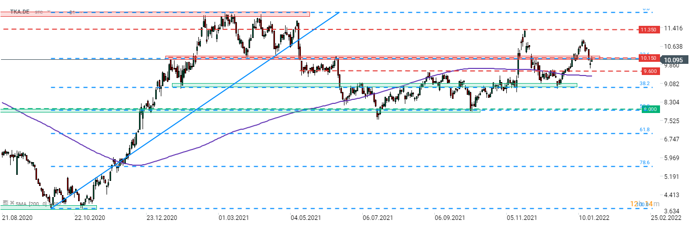 Thyssenkrupp (TKA.DE) cotiza al alza tras la noticia del acuerdo de submarinos alcanzado con Israel. Actualmente, las acciones están tratando de volver a subir por encima de la zona de precios de 10,15 euros después de fuertes caídas desde principios de año. En caso de que falle el intento de romper por encima de esta área y comience el retroceso, el soporte más cercano se puede encontrar en el nivel de giro a corto plazo en 9,60 €. Fuente: xStation5