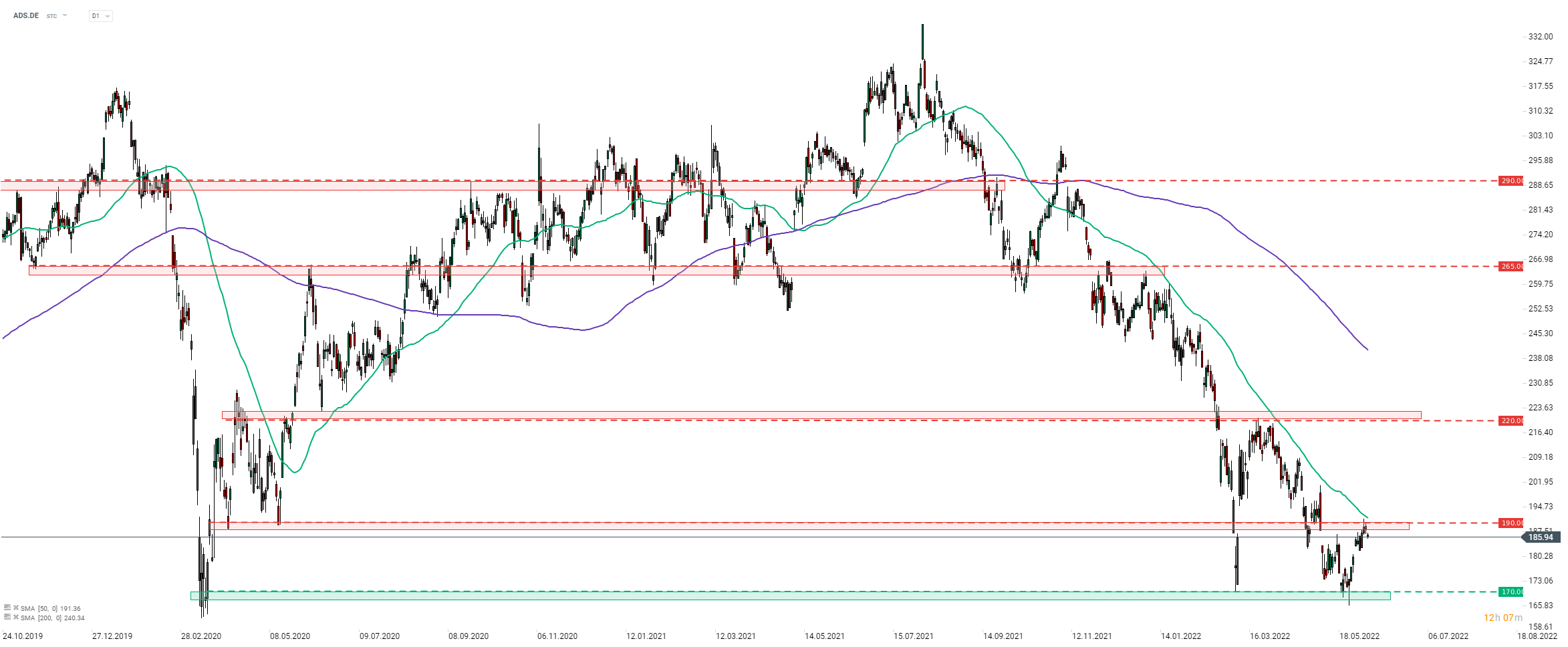 Adidas (ADS.DE) retrocedió un poco después de que Qontigo anunciara que la compañía sería eliminada de los índices Euro Stoxx 50 y Global 150. Las acciones han rebotado recientemente en los mínimos de la pandemia, pero la zona de resistencia de 190 € detuvo la recuperación. Tenga en cuenta que la media móvil de 50 sesiones (línea verde) actúa como una especie de techo para la acción. Fuente: xStation5