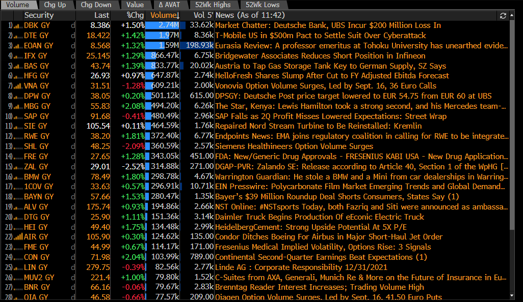 Las acciones más activas en el índice DAX (DE30). Fuente: Bloomberg