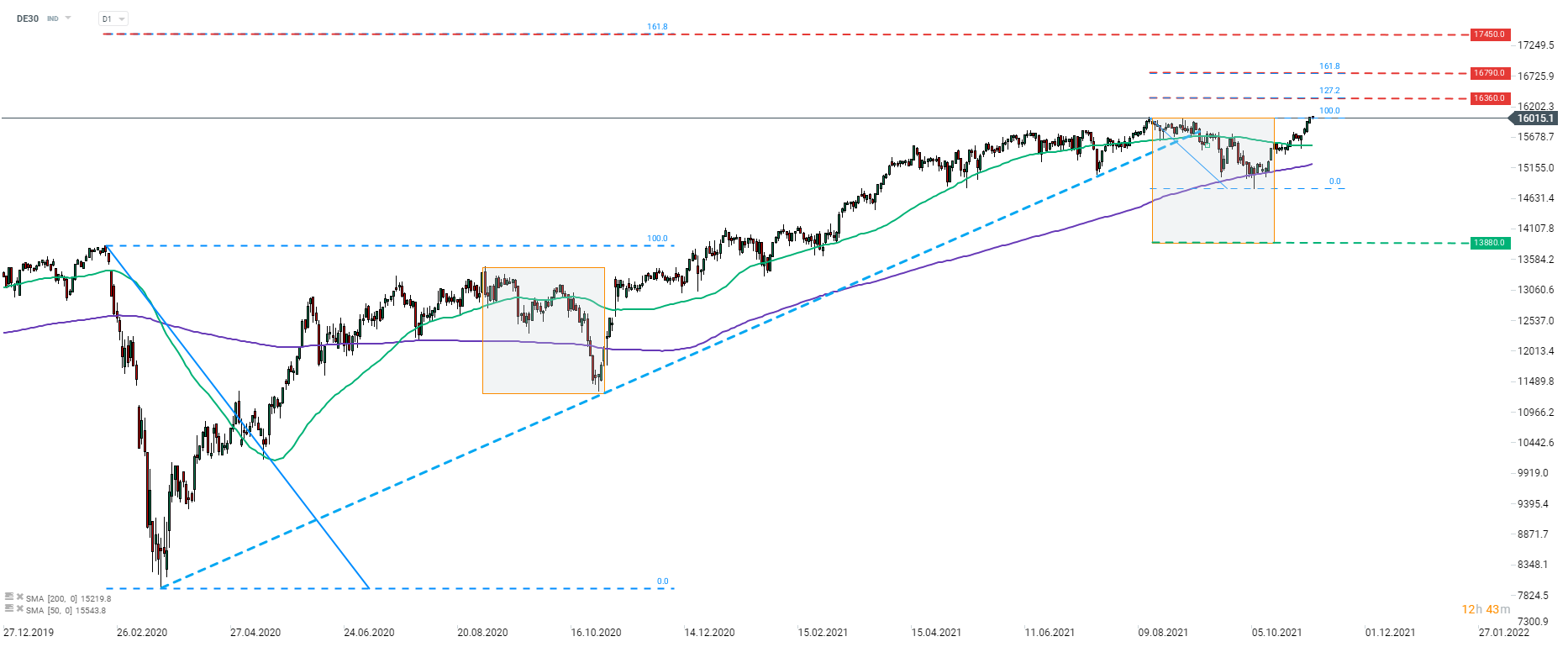 DE30 está probando máximos históricos. El índice alemán subió a 16.000 pts ayer tras la decisión del FOMC sobre la reducción gradual, pero ha tenido problemas para avanzar más desde entonces. Sin embargo, dado que el índice se mantiene en la zona y no se puede descartar una ruptura a nuevos récords, sería prudente observar los posibles niveles de resistencia en el futuro. Los retrocesos de Fibonacci ofrecen un indicio de que los retrocesos exteriores del 127,2% y el 161,8% de la corrección reciente son los primeros niveles de resistencia potenciales: 16,360 y 16,790 pts respectivamente. Fuente: xStation5