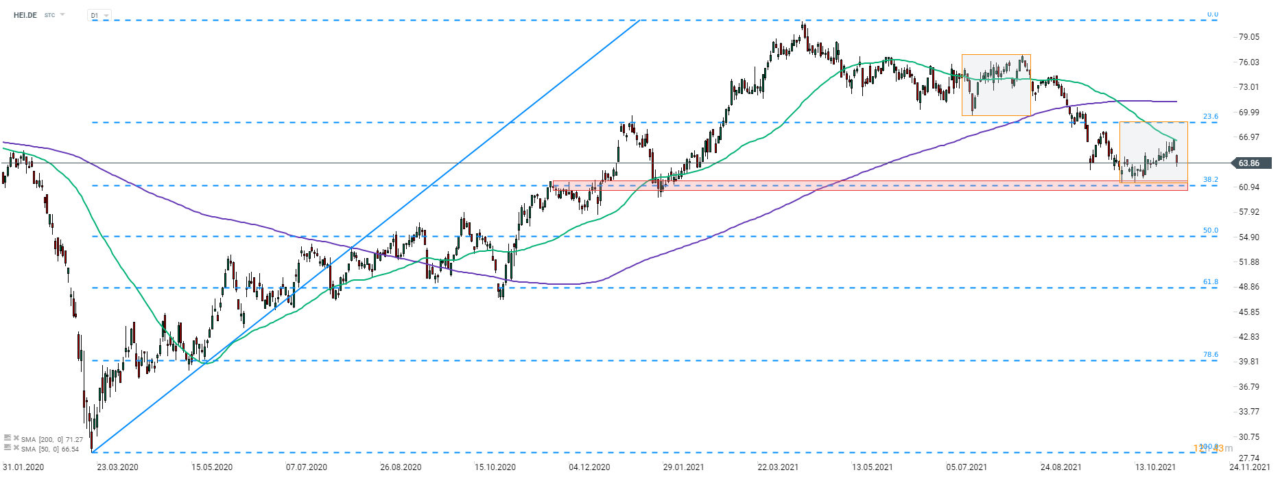 HeidelbergCement (HEI.DE) cotiza a la baja tras la publicación de las ganancias del tercer trimestre. Las acciones se están alejando de la media móvil de 50 sesiones (línea verde). El soporte más cercano se puede encontrar en el 38,2% de retroceso del movimiento de recuperación posterior a la pandemia cerca de la zona de 61,10 €. Esta es la misma área que se detuvo a la baja a mediados de octubre. Fuente: xStation5