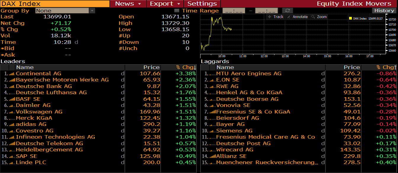 Valores del DAX a las 9:28 a.m. GMT. Fuente: Bloomberg
