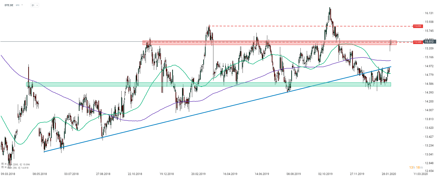 Deutsche Telekom (DTE.DE) surgió ayer por la noticia de que su subsidiaria recibió luz verde para fusionarse con Sprint (S.US). Sin embargo, una ventaja adicional para el valor está limitada por la zona de resistencia que oscila alrededor de € 15,50. Las acciones cotizan al alza hoy y, en caso de que se mantenga el impulso, podría haber un movimiento hacia los € 15.85. Fuente: xStation5