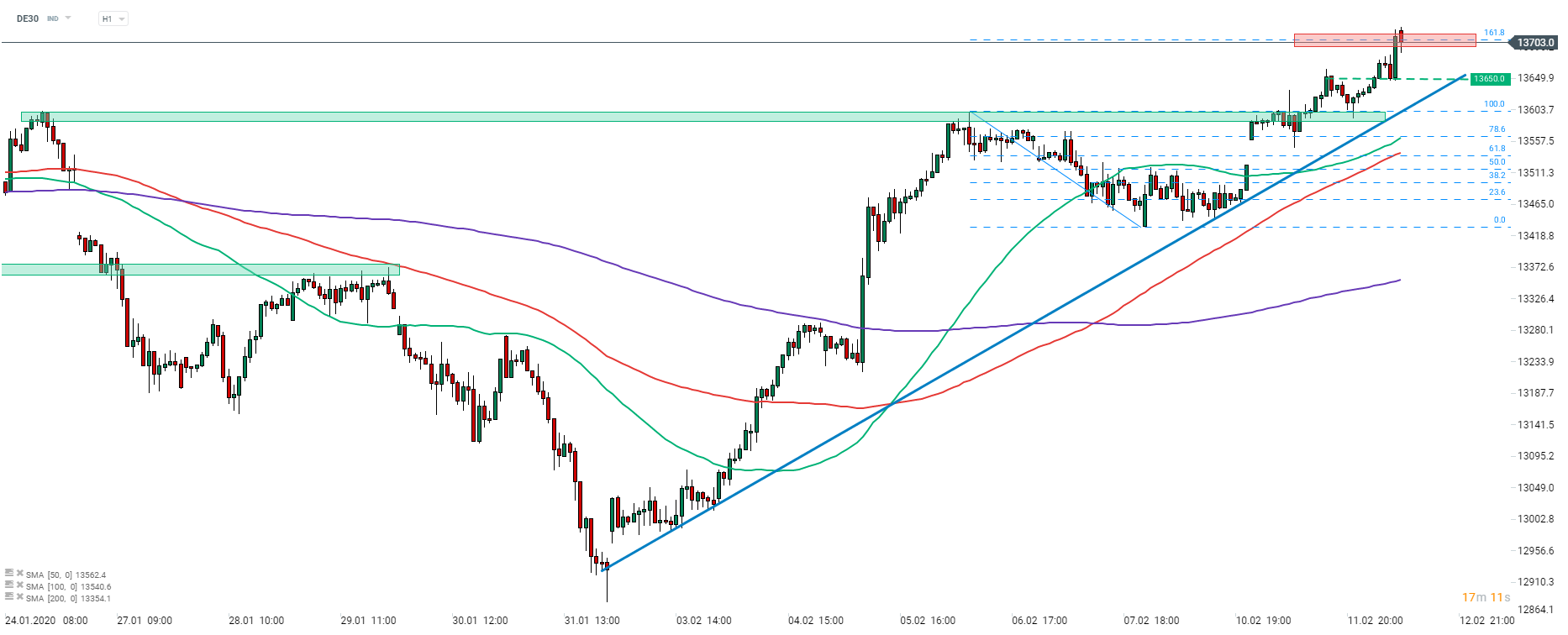 El DE30 logró alcanzar nuevos máximos históricos gracias al persistente optimismo en los mercados mundiales de acciones. El índice alemán rompió por encima de la marca de 13700 pts por primera vez en la historia hoy. Sin embargo, el movimiento hacia arriba se detuvo cerca del 161.8% de retroceso exterior de la corrección a la baja que comenzó el 6 de febrero. Este retroceso coincide más o menos con el mencionado nivel de 13700 pts, lo que lo convierte en un importante nivel de resistencia. Este es el nivel clave para ver durante la sesión de hoy. En caso de un retroceso, el soporte más cercano se puede encontrar en un nivel de swing reciente de 13650 pts.