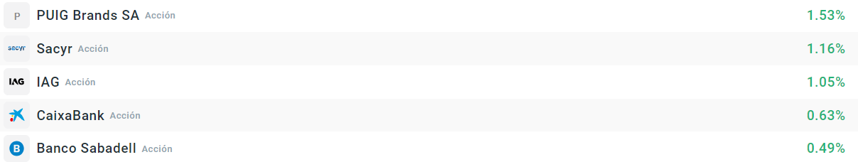Las subidas del Ibex35 están hoy protagonizadas por las acciones de Puig. La empresa de permufería y cosmética sigue por debajo de los 19€, que perdió como consecuencia de la rebaja de expectativas de crecimiento de Coty de la semana pasada. Ayer la estadounidense recibió un recorte de precio objetivo, pero esto no parece afectar a las acciones de Puig esta mañana. Otras con buen desempeño son Sacyr o IAG, que sube ya un 45% en lo que va de año.