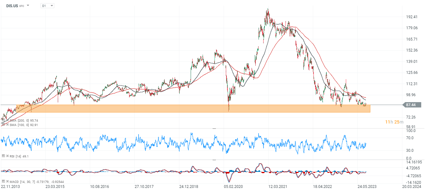 Las acciones de Disney (DIS.US) todavía están cerca de los niveles de 2014 y en el punto más bajo de la venta masiva de marzo de 2020 "Covid" y el desastroso cuarto trimestre de 2022 de Wall Street. Fuente: xStation5