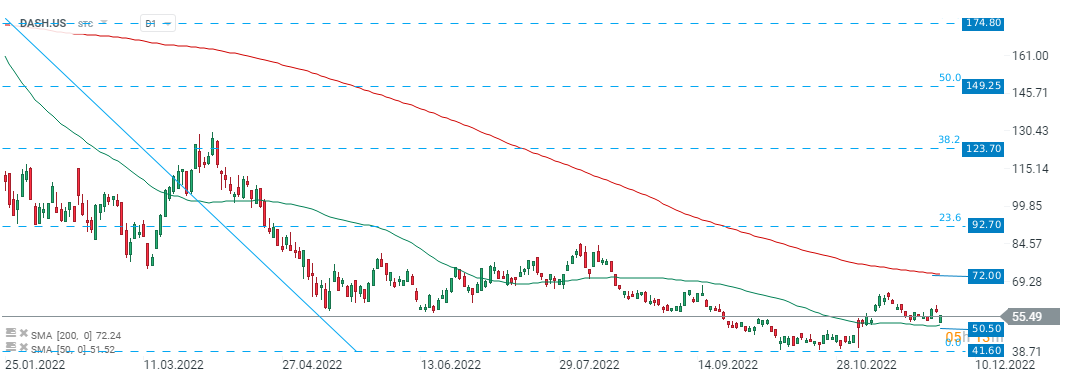 Las acciones de DoorDash (DASH.US) iniciaron la sesión de hoy con una fuerte baja, sin embargo, los compradores lograron borrar algunas pérdidas después de que los vendedores no lograron romper por debajo de 50 SMA (línea verde). Siempre que el precio se mantenga por encima de la corrección al alza hacia 200 SMA (línea roja), se puede lanzar. El soporte más cercano a observar se encuentra alrededor de los mínimos recientes de $41,60. Fuente: xStation5