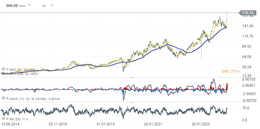 DR. Horton (DHI.US) sube casi un 11% después de que el mayor constructor de viviendas de Estados Unidos informara sus resultados del tercer trimestre. DR. Horton opera en 121 mercados en 33 estados. Ha construido más de 1,1 millones de viviendas en sus 45 años de historia. La empresa construye y vende viviendas unifamiliares y multifamiliares, propiedades de alquiler y ofrece financiación hipotecaria, servicios de títulos y seguros.