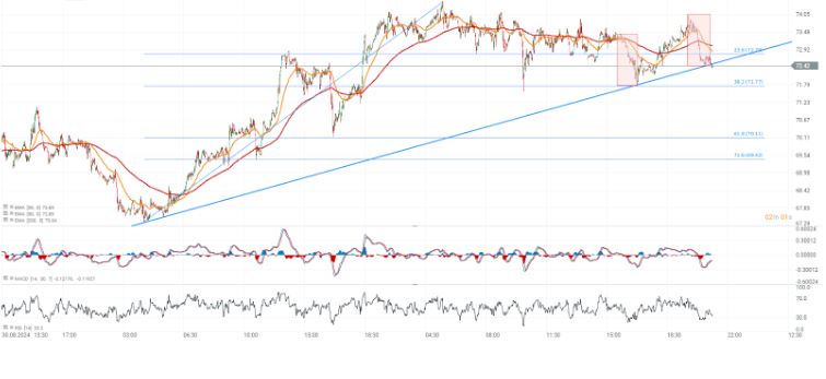 Si nos fijamos en la cotización algodón, podemos ver que el precio está poniendo a prueba la línea de tendencia contractual, y si hay un rebote desde este nivel, apoyado al mismo tiempo por una posible corrección (rectángulos rojos), podemos esperar un rebote hasta la zona de los 74 dólares. Otro impulso a la baja, por otro lado, podría llevar los precios a los 71,8 dólares, donde vemos el Fibonacci 38,2, y este escenario ahora parece igualmente probable. Los futuros de algodón están bajando hoy más del 1,5% hoy, lo que podemos justificar con un dólar todavía muy fuerte y un gran retroceso en los índices del petróleo y de China.