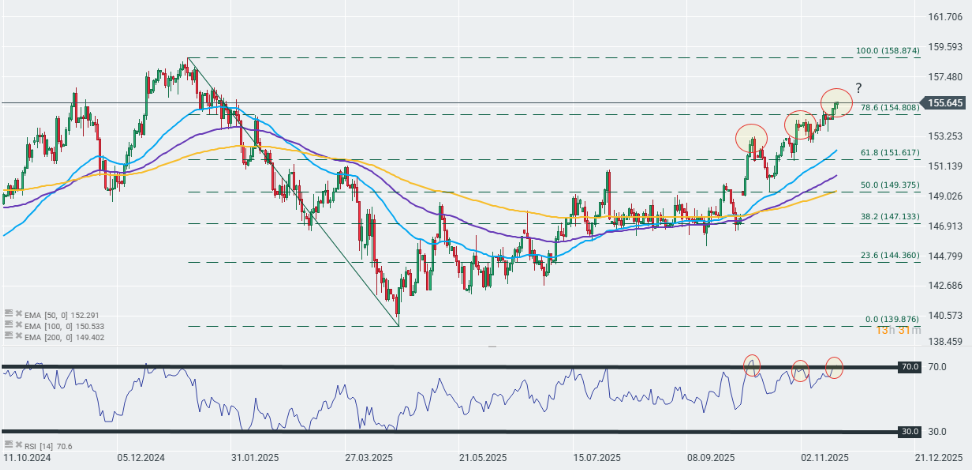 El par USD/JPY continúa su tendencia alcista, con el promedio de 14 días del indicador RSI superando la zona de los 70 puntos, considerada como el nivel de sobrecompra. Esto no significa necesariamente que la tendencia vaya a revertirse, ya que los fundamentos respaldan al dólar.