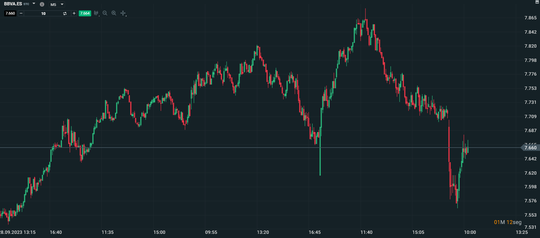 BBVA inició la sesión con el arrastre negativo del Ibex35. En los últimos minutos intenta recuperar los precios previos de la sesión de ayer. Fuente: xStation