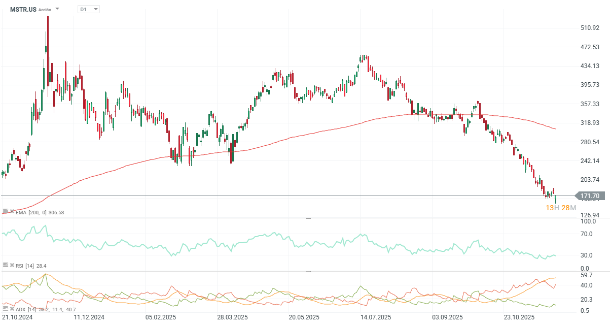 Las acciones de MicroStrategy se desplomaron más de un 10% el lunes y acumulan una caída del 66% desde su máximo histórico de noviembre de 2024.