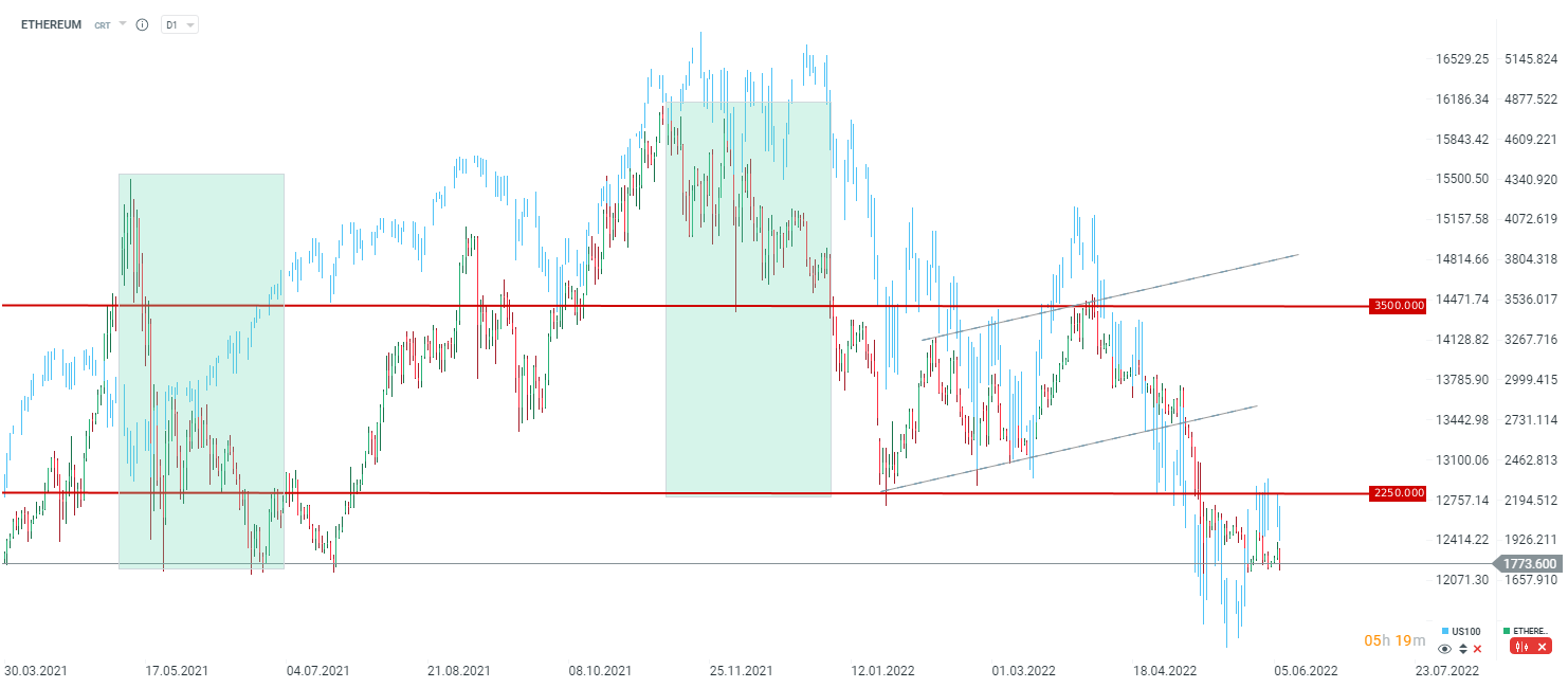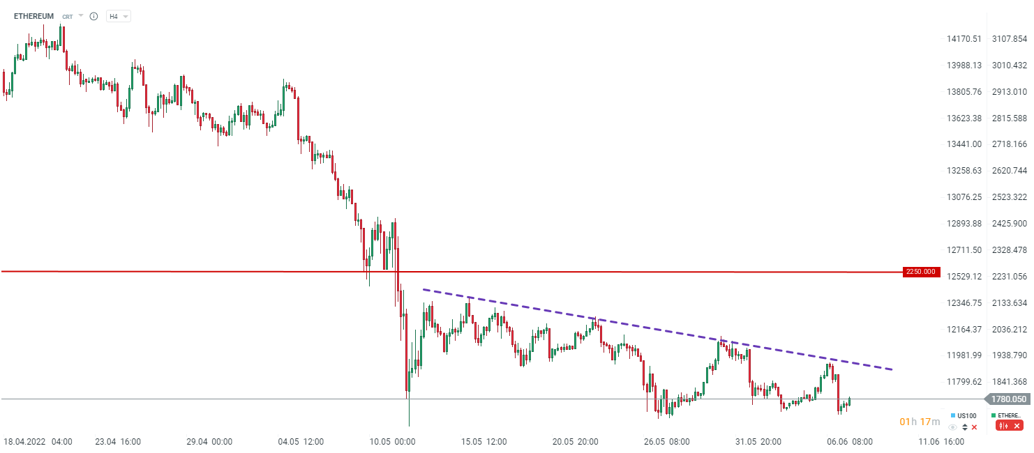 Para una señal alcista, necesitamos atravesar la línea de tendencia bajista y salir por encima de $2250, un lugar de resistencia muy importante, que está marcado por mínimos locales desde principios de 2022. Fuente: xStation5