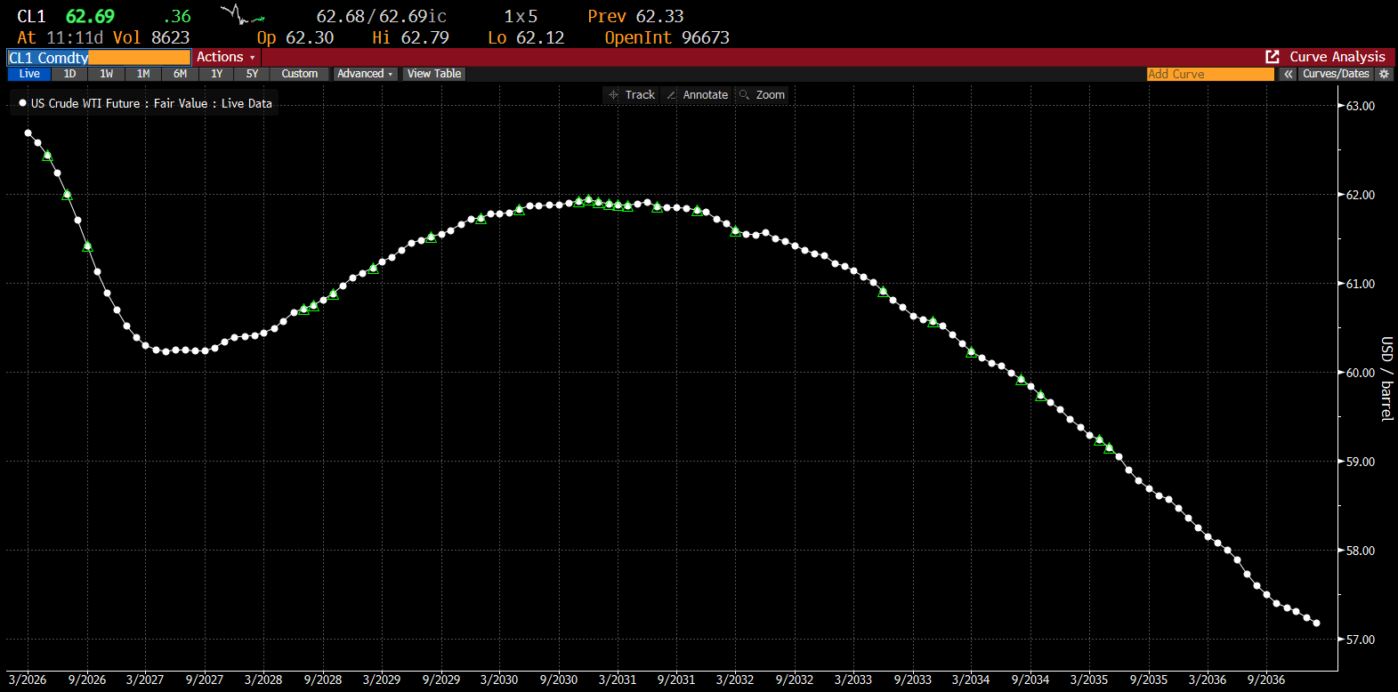 La curva de futuros del crudo muestra una forma muy poco convencional. Estamos viendo una backwardation significativa en los próximos 12 meses, de aproximadamente 3 USD. Esto indica que la prima asociada al riesgo de suministro es de al menos 3 USD. Antes de la escalada iraní, el petróleo cotizaba en contango hasta 2030.Fuente: Bloomberg Finance LP