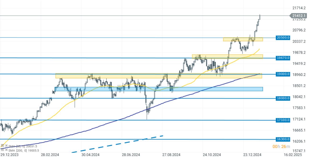 Desde una perspectiva fundamental, las valoraciones de las empresas alemanas siguen siendo significativamente inferiores a las de las acciones estadounidenses del S&P 500. Sin embargo, tampoco están en niveles bajos. El índice alem´na, el Dax 40, cotiza a una relación precio-beneficio (PE) de 17,8 y de 16,1 para los beneficios estimados para el próximo año. En comparación, las empresas estadounidenses del S&P 500 cotizan actualmente a una relación PE de alrededor de 28-29. La rentabilidad por dividendo del DAX se sitúa en el 2,63% en los últimos 12 meses.