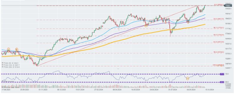 El índice de referencia alemán, el Dax 40, sigue subiendo durante la sesión del martes y está alcanzando nuevos máximos históricos. Parece que los puntos de soporte clave de la tendencia alcista general siguen siendo las zonas de máximos recientes (19.000 puntos), la EMA de 50 días (curva azul en el gráfico) y el máximo histórico recién alcanzado, que ahora es la principal zona de control para la oferta y la demanda. Fuente: xStation