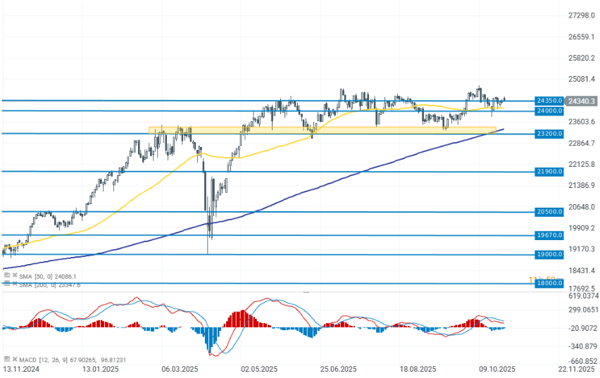 El Dax 40 baja un 0,15% hasta los 24.206 puntos, y se mantiene en un rango de consolidación de las últimas semanas. Para los alcistas, el soporte clave es el nivel de 24.000 puntos, mientras que la siguiente resistencia a atacar se sitúa en los 24.600 puntos.