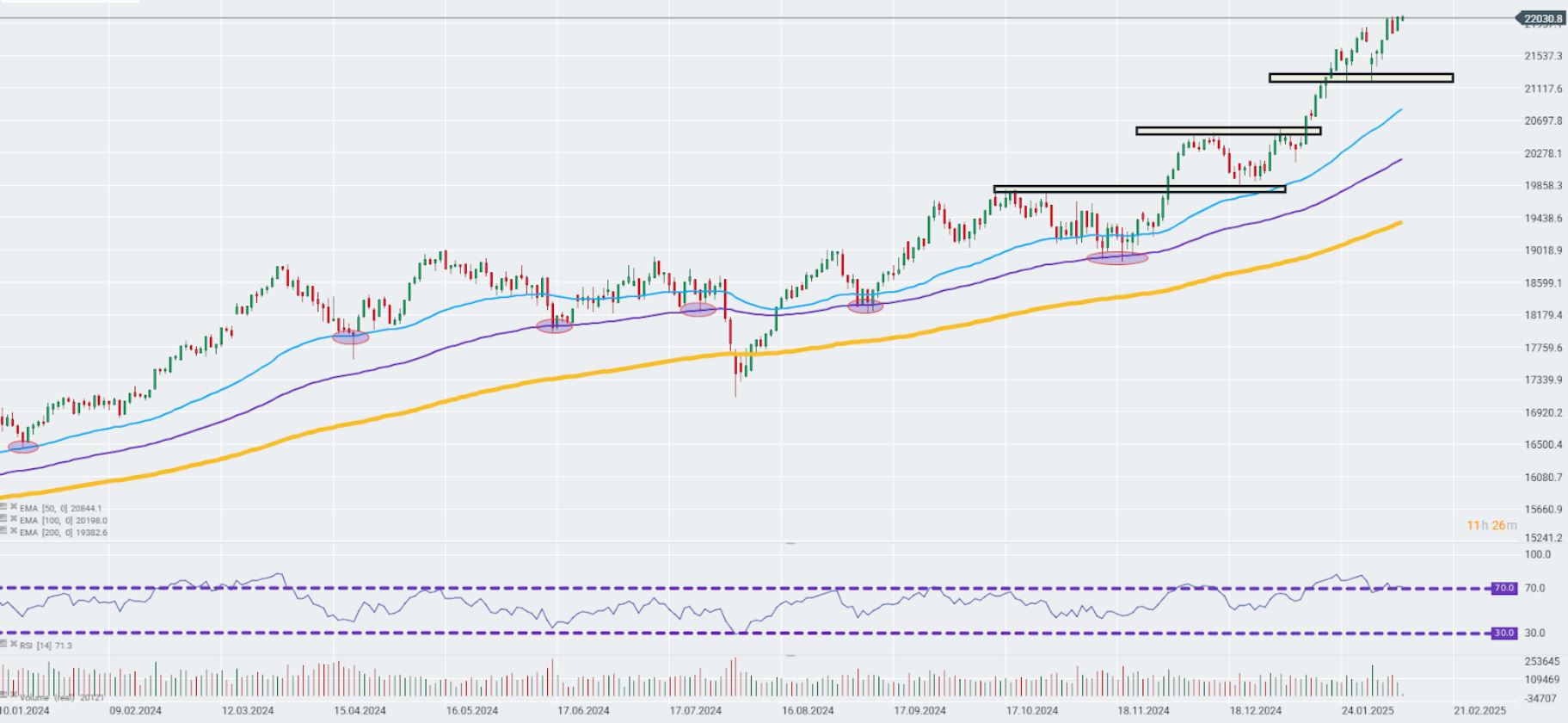 El Dax 40 alemán está ganando terreno hoy y se encuentra de nuevo en la zona de máximos históricos. El soporte más importante para el índice sigue siendo invariablemente la EMA de 50 días (curva azul en el gráfico) y el área de soporte de la zona de consolidación cerca de los 21.230 puntos. Técnicamente, sigue manteniendo una tendencia alcista estable todo el tiempo. Fuente: xStation
