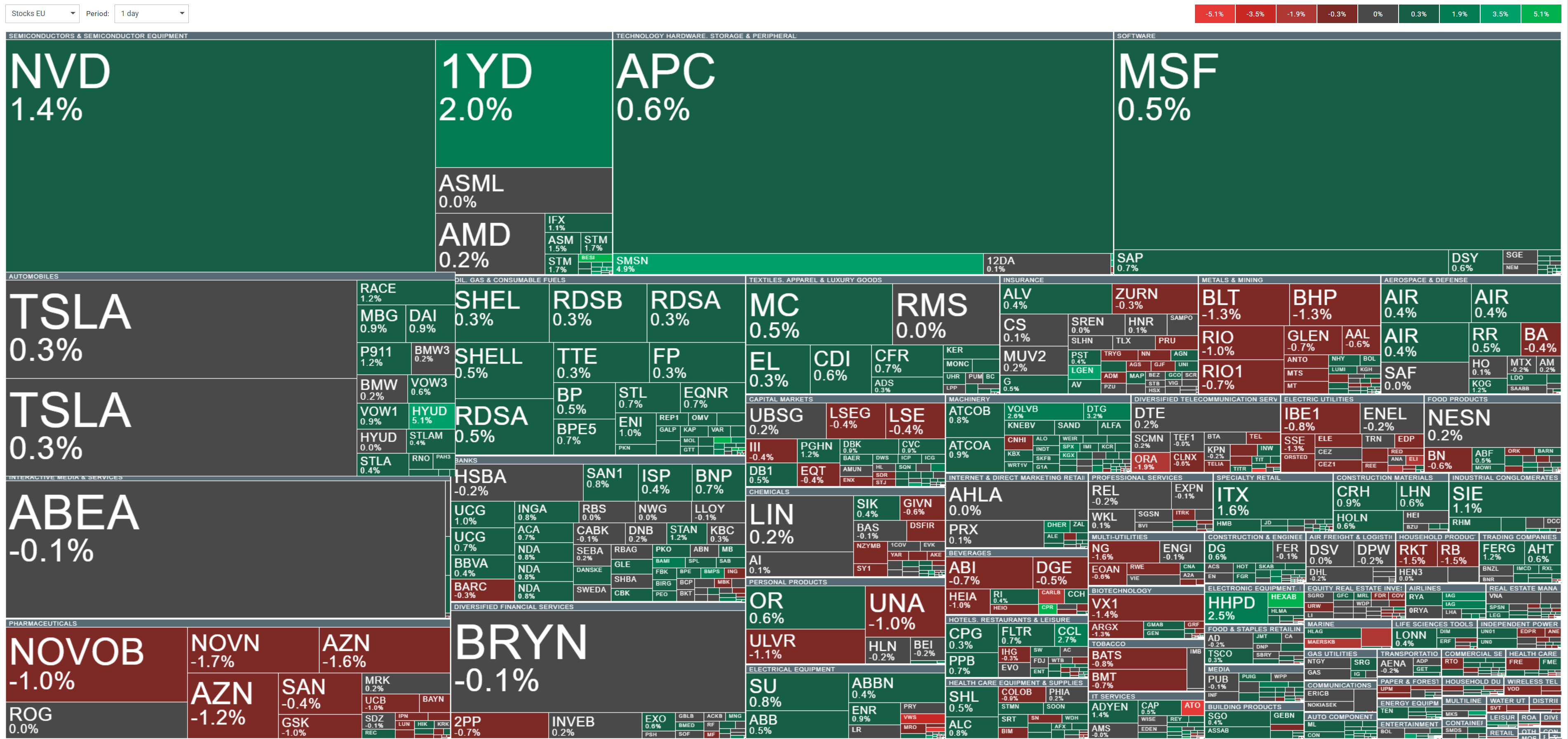 En cuanto al desempeño sectorial del Dax 40, el mercado muestra un panorama mixto, con siete sectores en territorio positivo y tres en territorio negativo. Las tecnologías de la información lidera las subidas (+0,82%), seguido de Industrias (+0,80%) y Finanzas (+0,60%). Los bienes raíces suben un 0,54% mientras que el consumo discrecional (+0,52%) y Servicios de comunicación (+0,16%) muestran subidas más modestas. Las cotizadas de bienes de consumo básico cotizan prácticamente planas (+0,08%), mientras que Servicios públicos (-0,05%), Salud (-0,09%) y Materiales (-0,12%) están en territorio negativo. El desempeño agregado del DAX muestra una subida del +0,54%, con una amplitud de mercado que indica un sesgo moderadamente positivo a pesar de la divergencia a nivel sectorial.