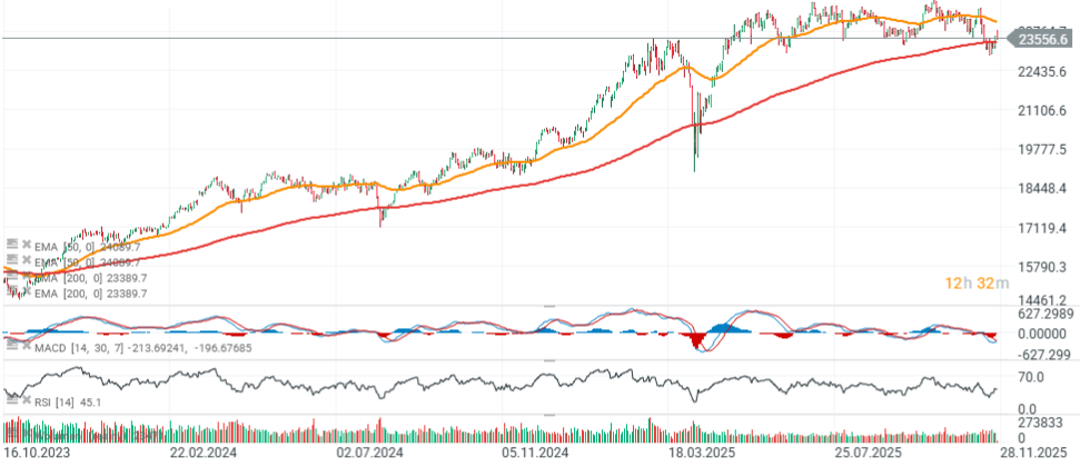 Tal y como se puede apreciar en la gráfica, el Dax 40 rebotó en la EMA de 200 días (línea roja) por tercera vez desde verano del 2024. En paralelo, el MACD sugiere una posible defensa del soporte (cruce dorado).