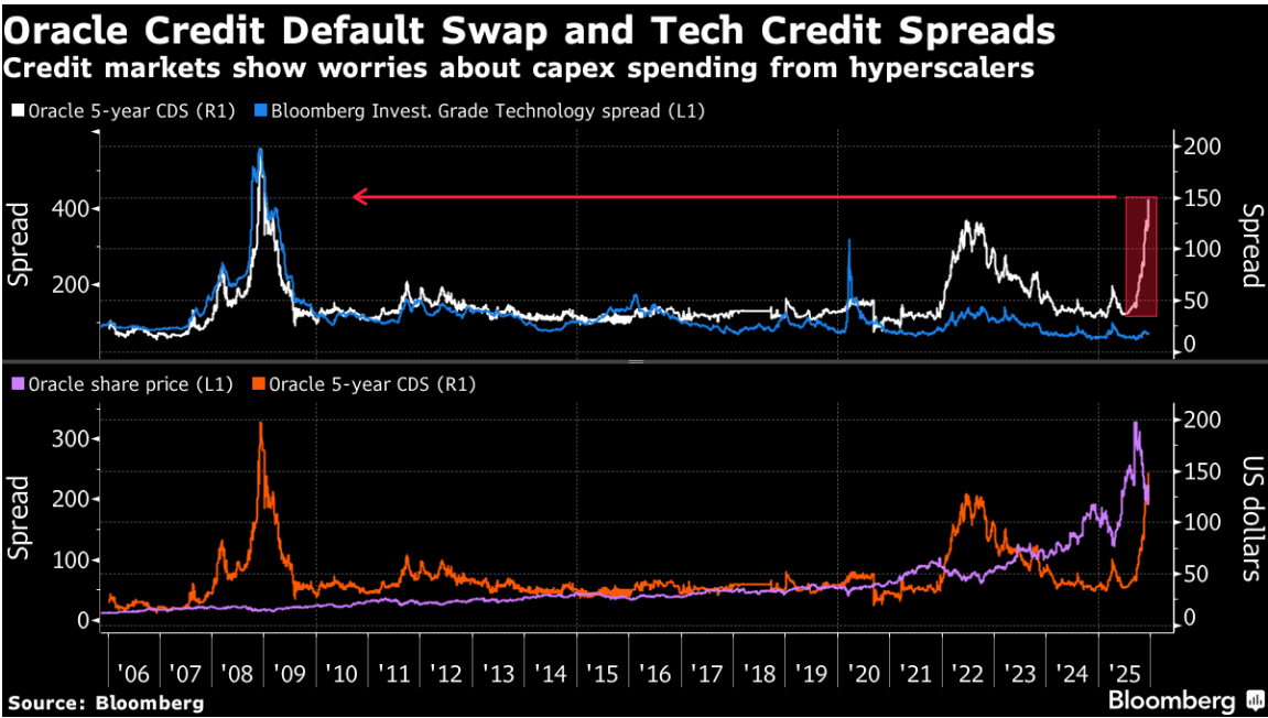 El mercado ve la mayor amenaza en las empresas tecnológicas, en particular aquellas centradas en la IA. El creciente interés en protegerse contra la quiebra de empresas como Oracle ha provocado una importante rotación de capital del sector tecnológico a otros sectores de la economía en las últimas semanas.