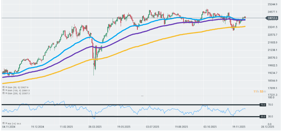 El Dax 40 cae un 0,5% en estos momentos pero se mantiene por encima de la media móvil exponencial de 50 días (curva azul en el gráfico) y la media móvil exponencial de 100 días (curva morada). Si el Dax 40 se mantiene por encima de las curvas mencionadas, podría iniciar un nuevo impulso alcista hasta sus máximos históricos recientes.
