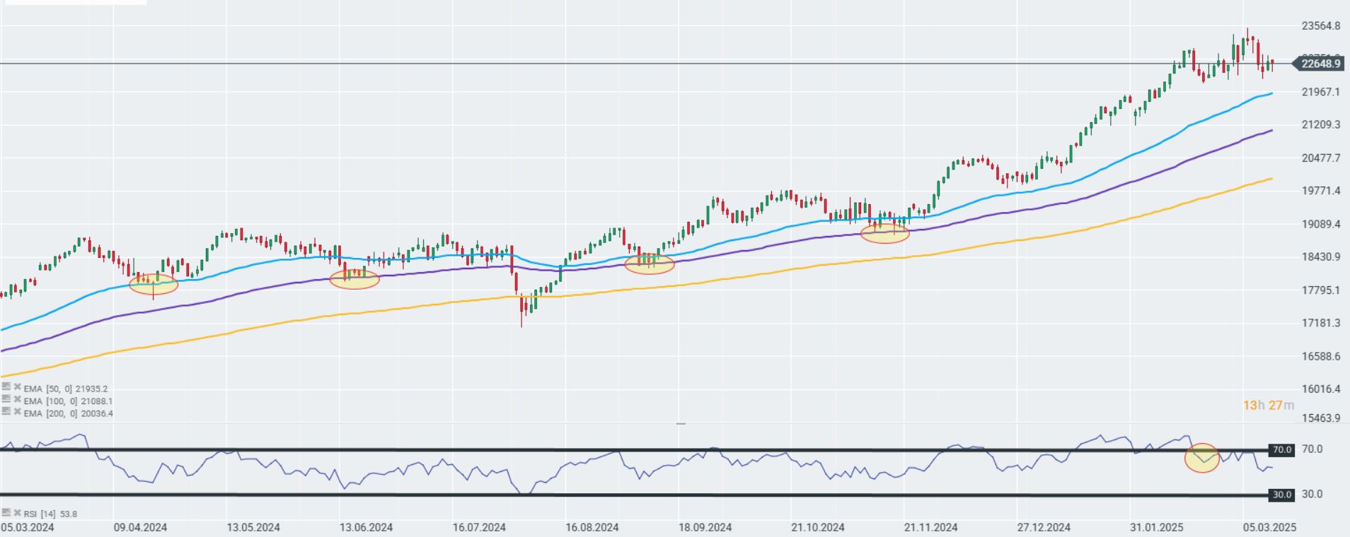 El índice alemán, el Dax 40, pierde un 0,35% intradía hoy. El soporte más importante para el índice sigue siendo la media móvil exponencial (EMA) de 50 días (línea azul en el gráfico) y el área de soporte de la zona de consolidación, en casi 21.230 puntos. Técnicamente, el Dax 40 mantiene una tendencia alcista estable. Fuente: xStation