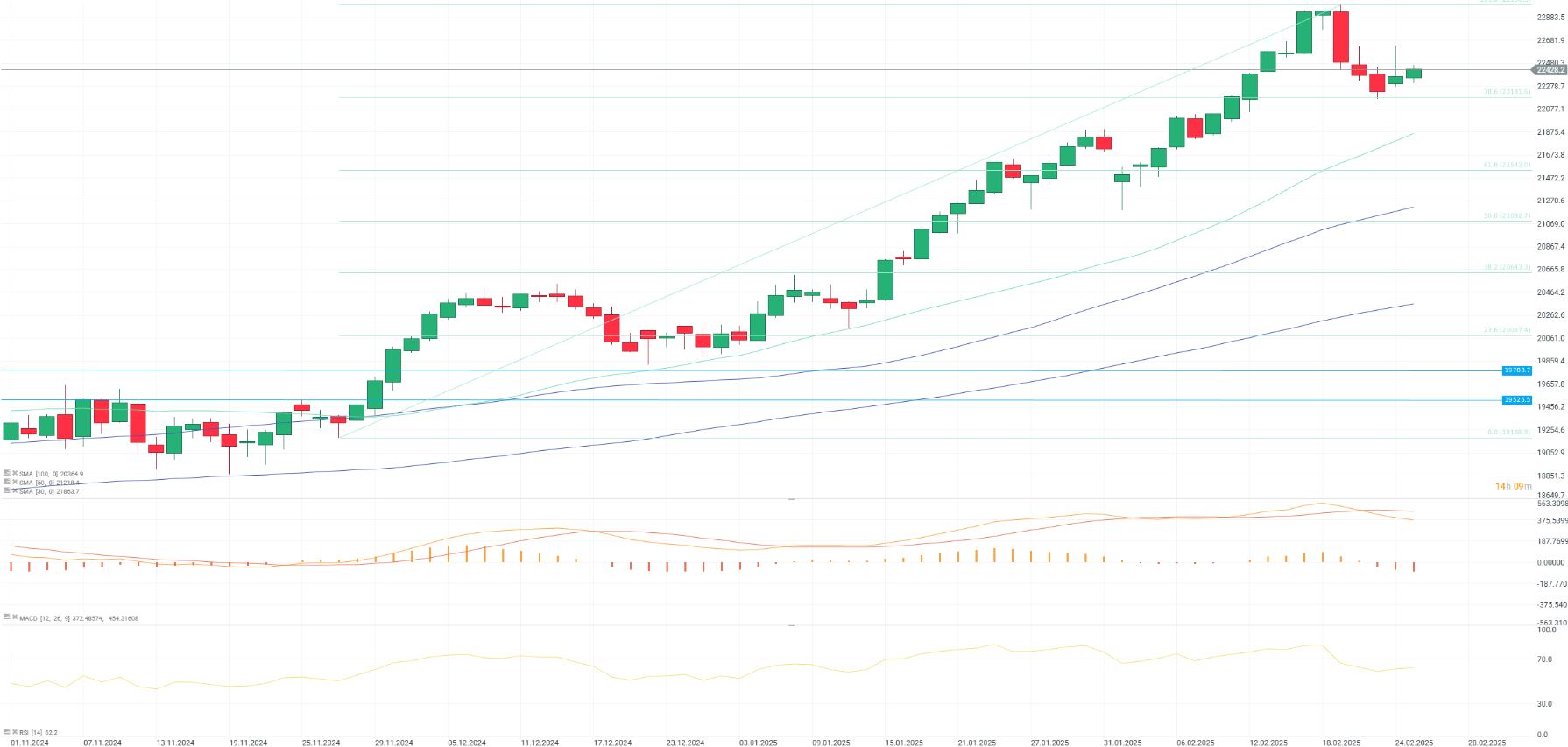 El Dax 40 está intentando recuperar el impulso alcista después de volver a probar el nivel de retroceso de Fibonacci del 78,6%. Los alcistas intentarán recuperar el máximo histórico en 22.996, mientras que los bajistas buscarán un movimiento por debajo del nivel de retroceso de Fibonacci del 78,6% y una prueba de la media móvil simple (SMA) de 30 días en 21.864. El RSI está en divergencia bajista, que podría romperse si el máximo actual supera el mínimo anterior. El MACD está empezando a ajustarse después de un cruce bajista. Fuente: xStation